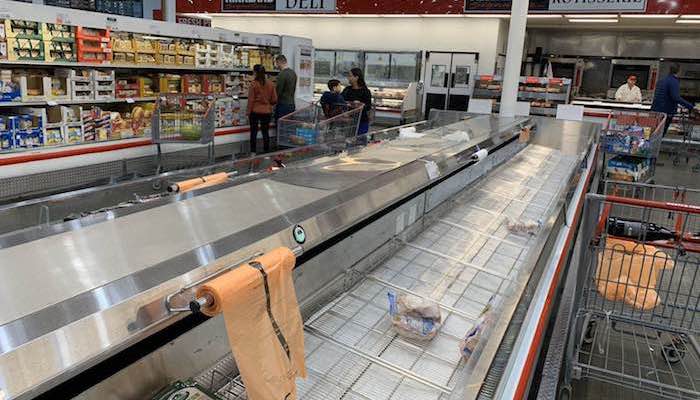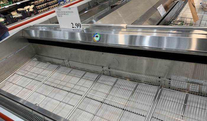 3月11日,我去连锁仓储超市Costco扫货,鸡肉柜台全部清空,婴儿湿纸巾尿布缺货严重,瓶装水也是大家抢购的重点。