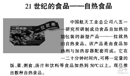 35斗检索到国内有关自热食品最早的报道,来自于1998年《江苏信息科技》发布的一篇产品咨询。文中将自热食品称为“21世纪的食品”,研发单位是中国航天工业总公司八五一研究所。这款号称“一拉就热”的自热食品,是由食品加热剂与加热容器配套而成,它可以在一二十分钟内,将一定量的饭、菜、粥食、汤汁和饮料等食品加热到50℃以上,并称其产品品类包括自热盒饭、自热菜盒以及自热黄酒等;产品适用场景包括工作快餐、旅游、野外作业方便餐,以及矿井、救灾等环境。