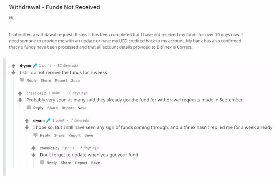 2018年11月 Reddit论坛网友提出的对bitfinex提现延迟的质疑