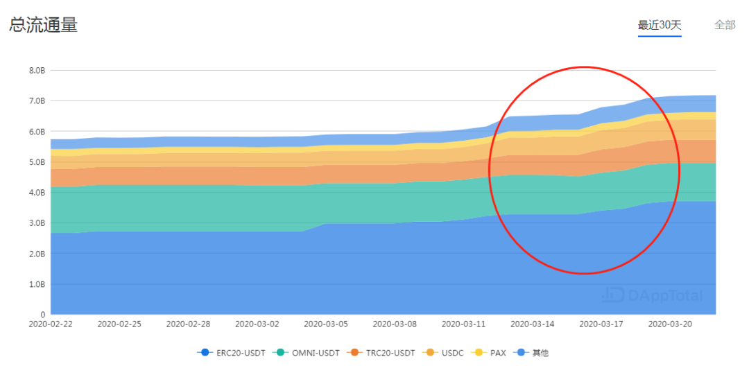 暂时抛开一直以来的虚假超发问题不提,增发可能导致的后果更值得讨论。根据下图DAppTotal.com的数据显示,在这次市场大跌时,以USDT为首的稳定币频频增发,以增加场内流动性,缓解市场进一步下跌。