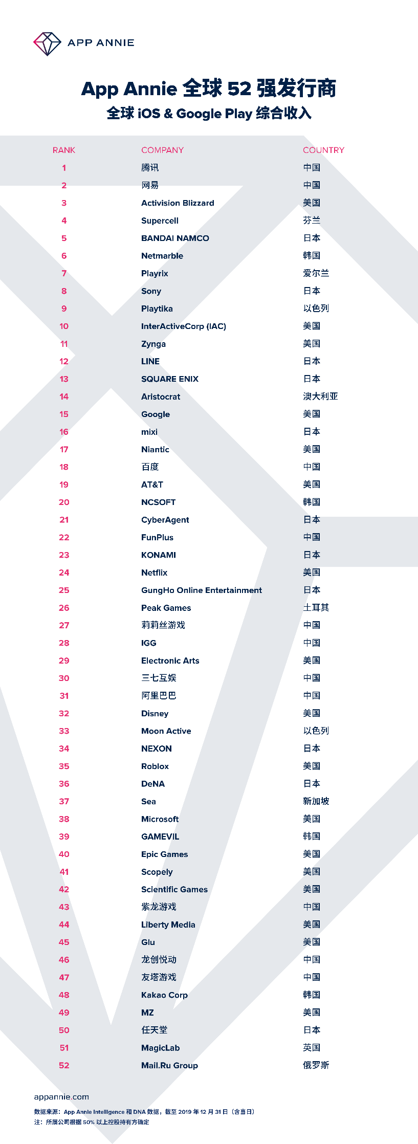 3月24日,应用分析机构App Annie发布了2019年“52强发行商”榜单,揭晓了苹果App Store与Google Play商店收入最高的52家发行商,并盘点了2019年的应用现象、解读了现今的应用流行趋势。