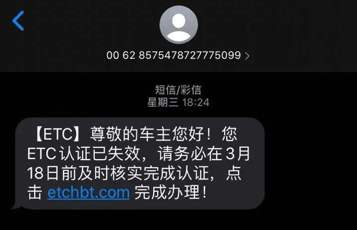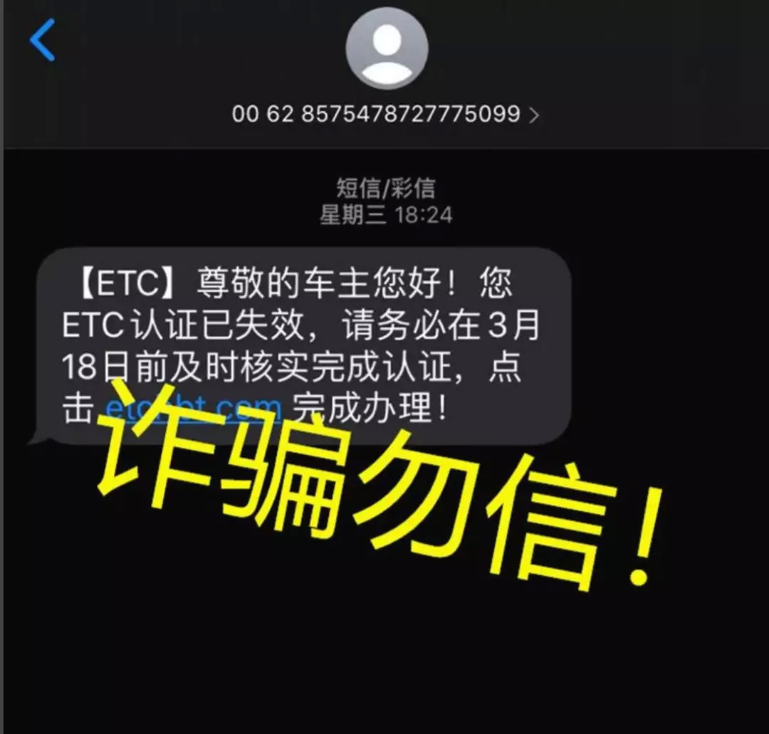 近期有不少不法分子自称ETC工作人员,打着“认证失效”、“办理到期”的名义,向车主发送附带“认证”链接的诈骗短信。因有不少车主忘记了自己办理ETC的时间,往往对短信内容信以为真,按短信要求点击了链接并填写了相关信息,从而造成财产损失。