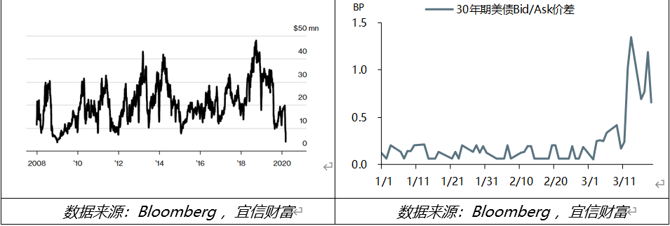 更糟糕的是,30年期美国国债买卖报价价差(Bid/Ask spread,以收益率计算)自3月初提升,并在3月11号到3月13日这几天急剧恶化,3月13号的买卖价差高达1.35bps,破纪录的高位。巨幅买家和卖家的价差反映了流动性的严重紧缩,意味着卖家和买家难以很快达成一个成交价格,在国债价格相当波动的情况下,给国债券商交易商带来巨大压力 。交易商很难以通常的有效的方式定价和清算国债交易。国债市场交易的失效对金融市场的其它部分有广泛的负面影响。