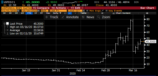 FRA/OIS利差从今年2月底开始快速攀升,在3月5号到13日这几天翻倍一度突破80bps,显著高于正常情形下约10-20bps的数值。虽然美联储3月15日紧急降息后,该指标回落至24bps左右,但近两日再度回升到45bps。