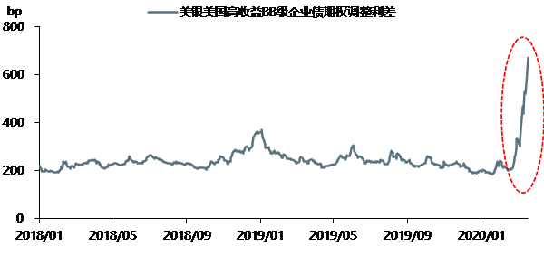 在美联储两次紧急降息后和近期多个其它政策刺激后,BB级企业债(高收益债)平均收益率从3月4日的3.88百分点一路上涨至近期的6.98百分点,BB级企业债与长期国债利差也从3.03%扩大至6.18%。近期市场对经济和经济前景恶化的担忧有提升,从公司的角度,他们更为担心收入下降,公司基于通过各种方式尽量筹借现金,连锁反应对企业信贷市场带来打击,使得各种企业债利差大幅提升。利差的提升反过来也意味着企业更难得到资金。这也是美联储为什么出台政策增加市场流动性的因素之一。