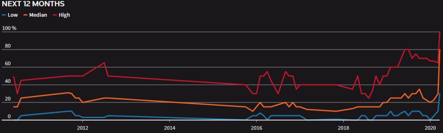3月16日美国总统特朗普在新闻发布会上称,美国经济可能会由于新冠肺炎疫情陷入衰退,这是他首次承认疫情爆发可能带来严重后果。同时,不少投研机构近期预测全球经济衰退即将到来,最坏的预期是今年全年全球经济都会负增长。路透社上周日的调研结果显示,未来12个月美国陷入衰退的概率达到80%,两周之前该概率仅为30%。