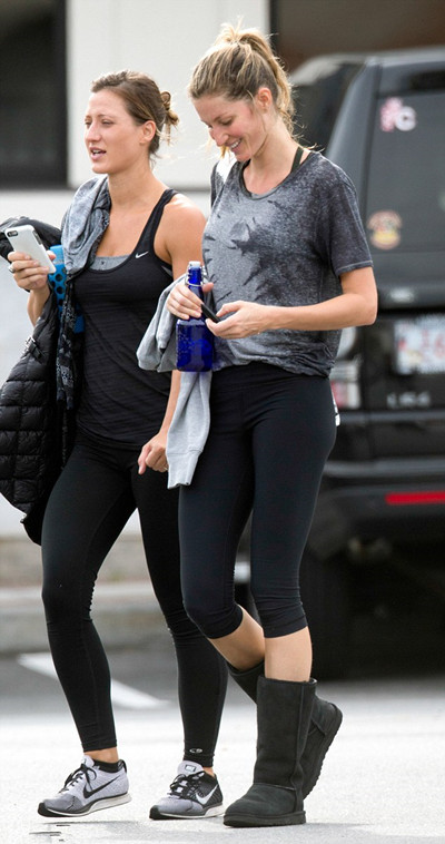 吉赛尔·邦臣离开的时候手里拿着一瓶水,手臂上还搭着一件运动衫,一边还和一起锻炼的好友愉快地交谈着。