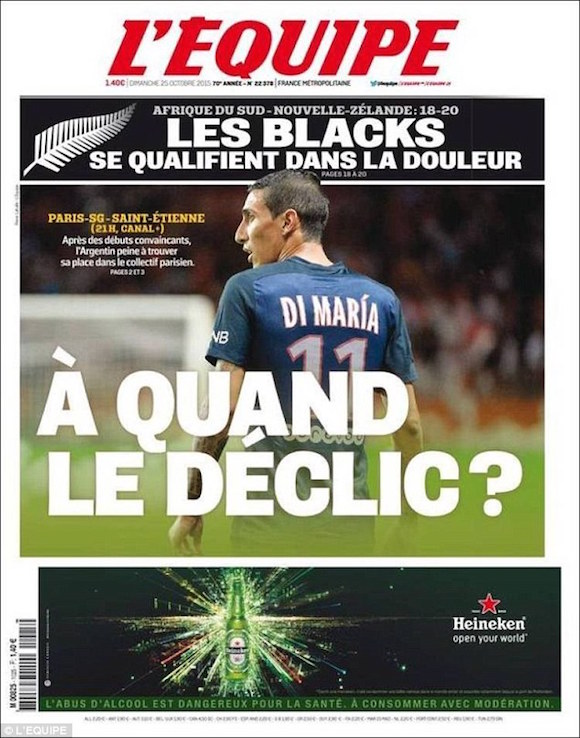 安赫尔·迪马利亚最近状态不好,法国著名媒体《队报》甚至质疑这位阿根廷球员到底什么时候才能真正融入巴黎圣日耳曼。迪玛利亚今年夏季以4400万英镑的身价从曼联转会到PSG,不过在此之后,他一直没能表现出在皇马时的良好状态。迄今为止,他打进了三球,贡献四次助攻,但他依然没有完全融入新的球队。