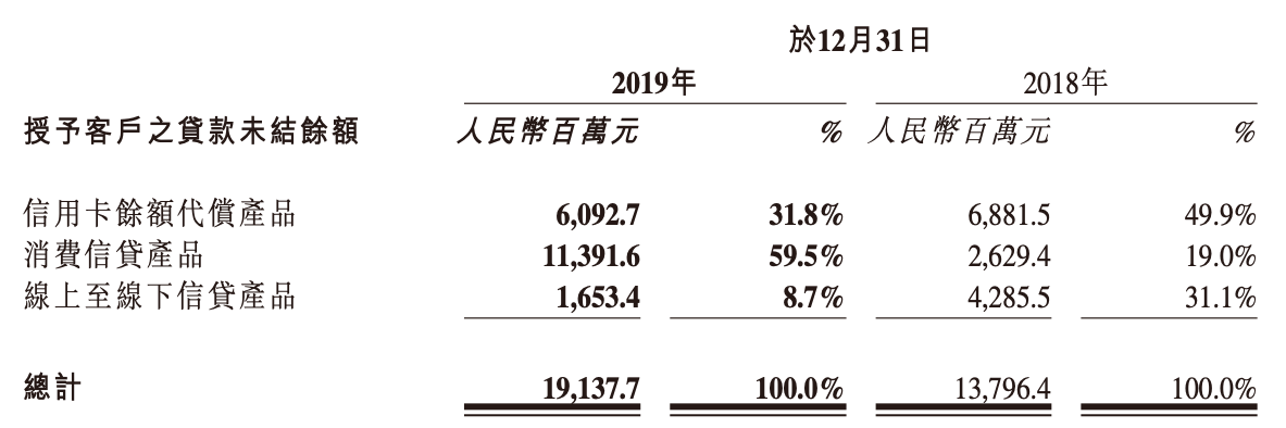 截至报告期末,维信金科贷款业务余额总计191亿,上期数据为137亿;其中,信用卡余额代偿产品60亿,同比降11%;消费信贷产品113亿,同比增333%;线上至线下信贷产品16亿,同比降61%。