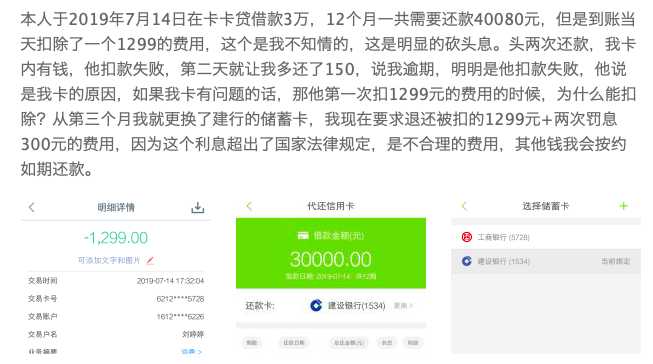 据用户公开的信息,其在维信金科借贷的豆豆钱包放款方包括盛银消费金融、长银消费金融等。豆豆钱、卡卡贷仍不断受到砍头息质疑,用户投诉2019年在借款到账后被扣除800到1299元不等的担保费用,流水显示担保方包括鸿飞担保,有投诉称还涉及维仕担保。此前,维信金科此前被指搭售保险费用,有用户向保险公司投诉要求取消被拒绝。