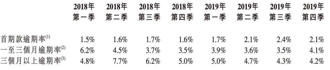 报告提到,在2019年第三季度,维信金科曾面临第三方数据服务中断、P2P平台持续倒闭造成的连锁反应,逾期率上升;在第四季度有所下降,首期逾期率自2019年二季度起超过2%达到2。1%,一至三个月逾期率为4.1%,三个月及以上逾期率为4.2%。维信金科预测2020年整体的首期逾期率为2%左右,会考虑新冠疫情调整信贷政策。