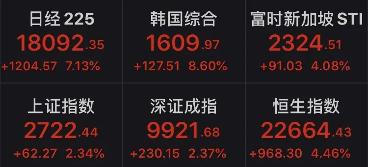 在强力刺激和预期之下,3月24日,亚太股市全线大涨,如下图。