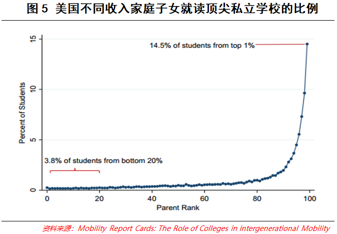 本来高等教育是实现阶层跃升的最有效途径,但美国现在的高等教育实际上是在加剧阶层固化。在美国顶尖私立大学(常春藤联盟、芝加哥、斯坦福、麻省理工、杜克大学)中,来自底层20%家庭的学生只有3.8%,来自底层50%家庭的学生只有13.5%,而来自顶层1%家庭的学生却高达14.5%。顶层1%家庭的孩子就读顶尖私立大学的概率是底层20%家庭的76倍多。