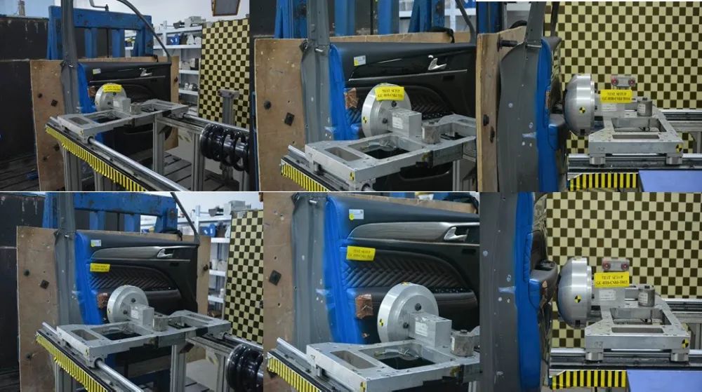 这时候车门的安全保护也很重要了。因此工程师设计了一种动态侵入测试,具体做法是,将门饰板总成通过模拟实车安装状态的工装固定在测试台架上,使用20kg的冲头(模拟人体的不同区域),沿Y轴直线冲击门内饰板。