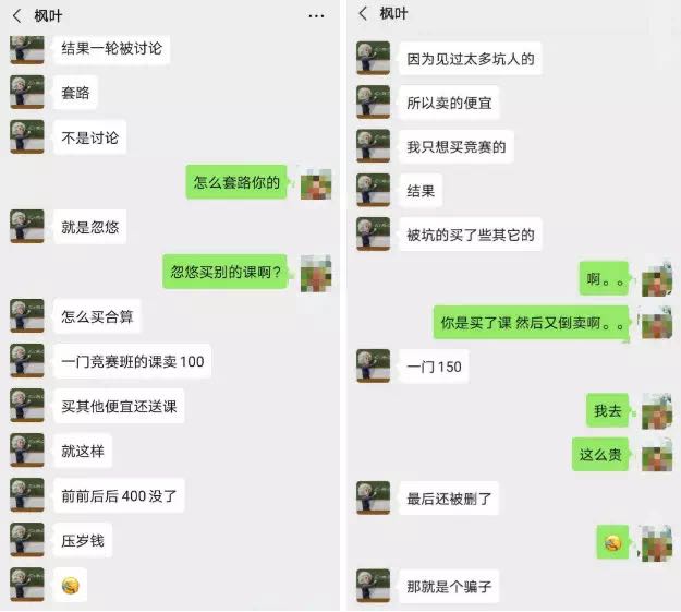 近日,燃财经以买家的身份,在百度贴吧上添加了一位卖家的微信,对方自称是一名初中生。“我本想在贴吧上购买初中数学竞赛资料,结果被盗版商各种套路,一门课程卖100元,买其他便宜的课程还送课,前前后后搭进去400多块压岁钱,结果课程驴唇不对马嘴。”这位卖家说。
