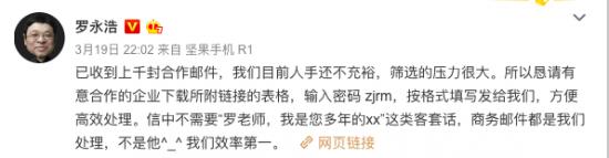 当晚,罗永浩就发微博宣布收到上千封合作邮件,并自言筛选压力很大。
