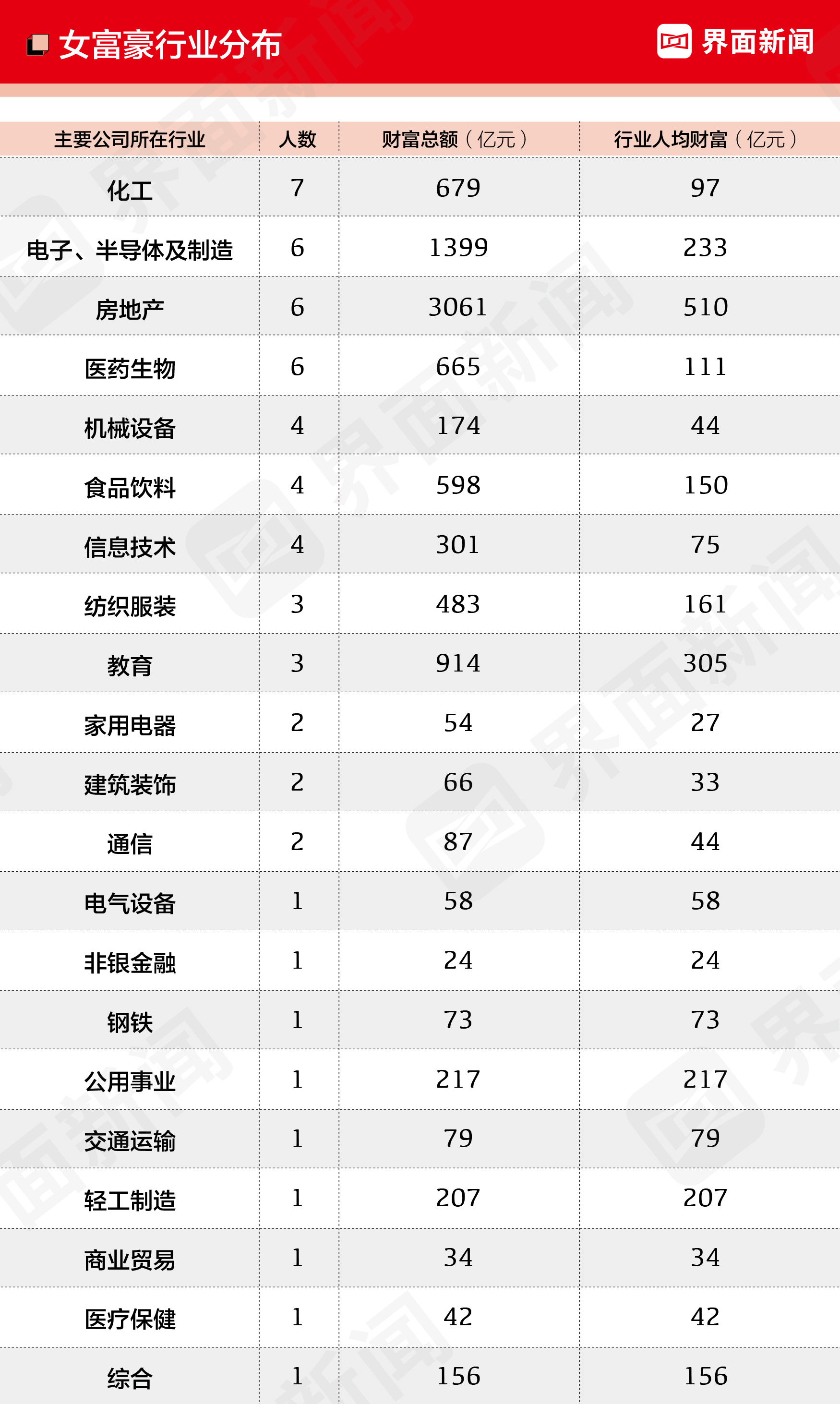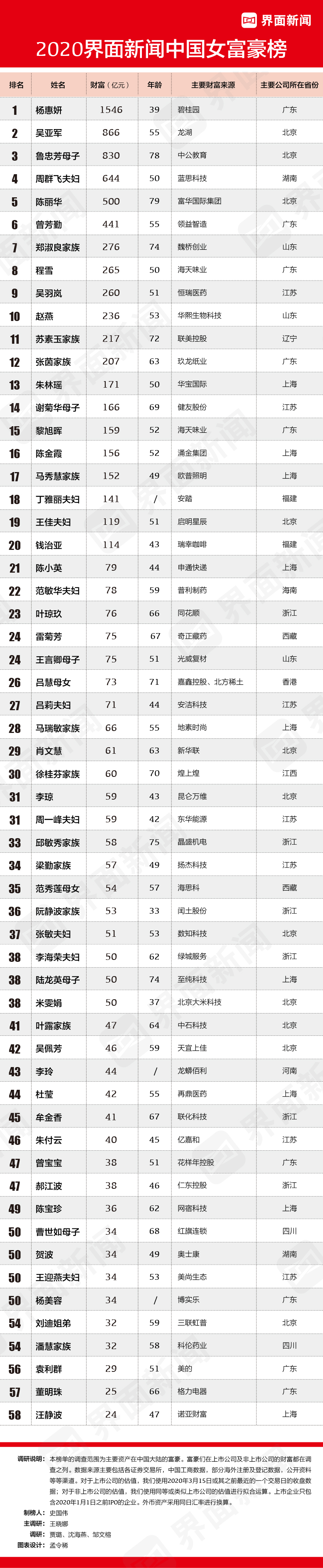 界面新闻第三年推出中国女富豪榜。新冠肺炎疫情之下,中国经济所面临的内外部压力持续走强,各行业各领域都经受了不同程度的打击,但也有诸如在线教育、生鲜电商、物流配送以及远程办公等互联网企业受此次疫情中非但毫发无损,反而大放异彩。