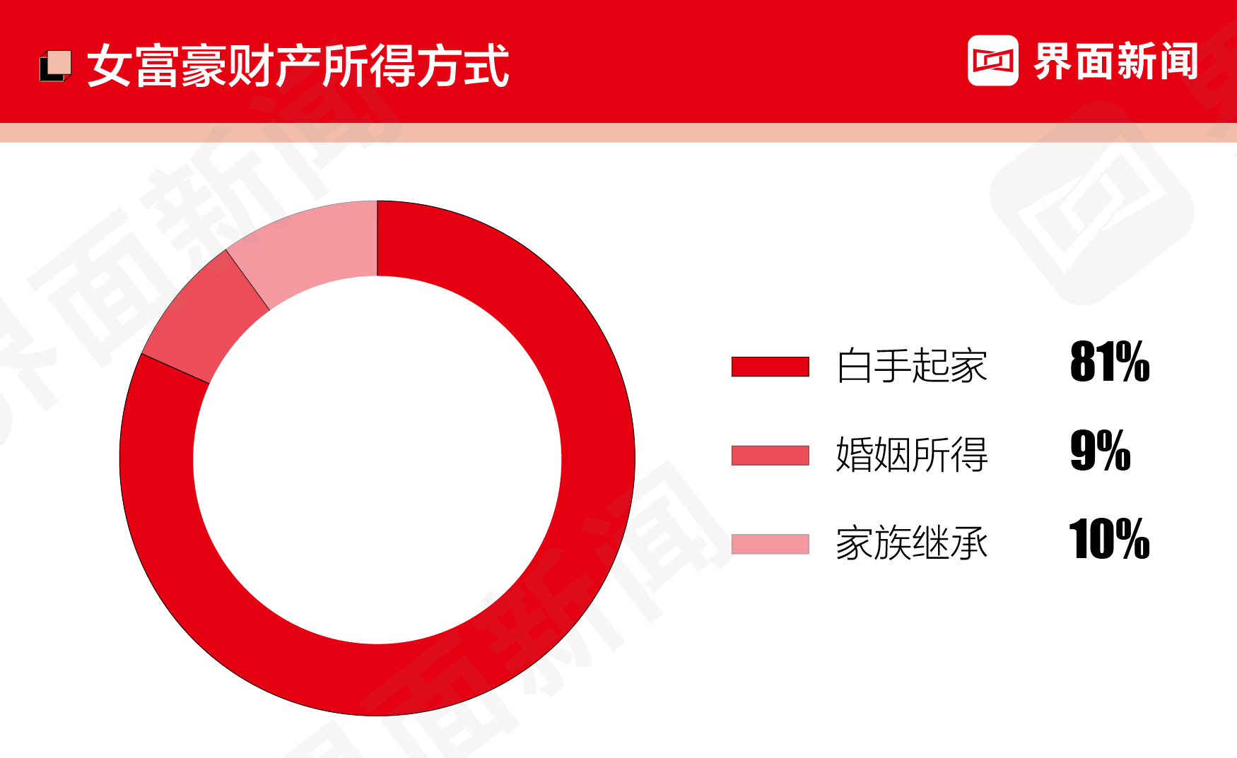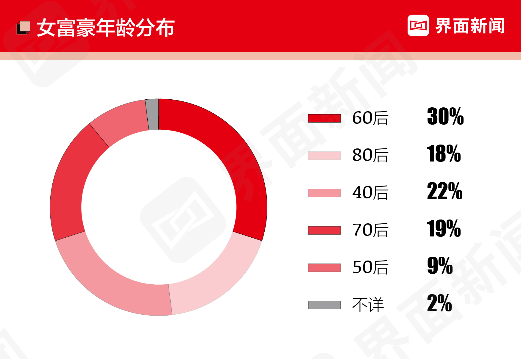 财富来源方面,81%的上榜女士财富依靠个人奋斗所得,这当中就包括9位新上榜女富豪,如瑞幸咖啡的钱治亚、天宜上佳的吴佩芳以及再鼎医药的杜莹等,也有常年霸榜的女富豪,如榜单第二位的吴亚军女士,以及现年79岁高龄的富华集团董事局主席陈丽华女士;6位女士则得益于家族企业的壮大,如碧桂园联席主席杨惠妍以及安踏集团丁雅丽女士等;其余5位女士的财富则来源于婚姻关系。