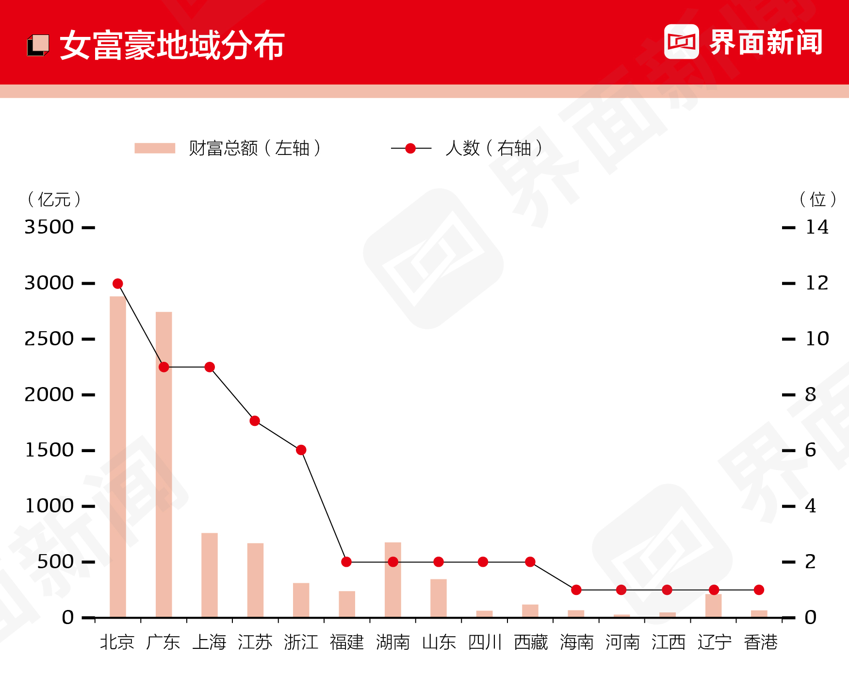 地域分布上,北京、广东依旧在女富豪人数和其财富总量上各领风骚。北京上榜人数12人,尽管低于去年15人,但其2897亿的财富总额却比去年增长79.60%;广东有9位女富豪上榜,合共持有超过2744亿资产,相对去年上涨45.72%;而得益于本土体育品牌安踏的优秀业绩以及瑞幸咖啡的上市,从福建走出来的女富豪持有财富值则实现超过200%的增长。