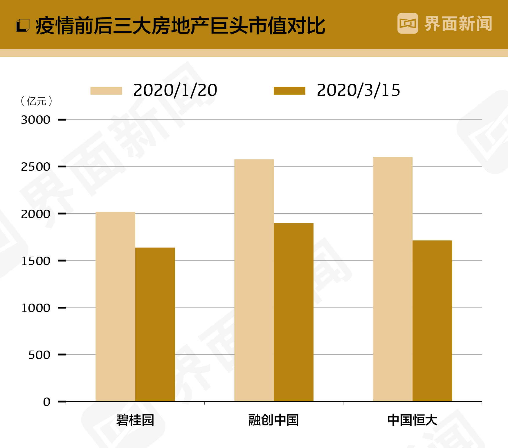虽然从整体来看,房地产行业所受影响不大,但是从房企三大巨头的市值表现可以看出损失比较惨重。对比疫情前后(以2020年1月20日和2020年3月15日为例,若非交易日,则取前一个交易日的值),中国恒大市值减少了34%,不到一个月的时间市值蒸发了近千亿。融创中国和碧桂园的市值也分别有26%和19%的缩水。