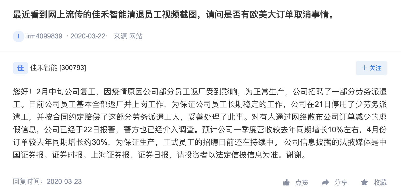 佳禾智能的回应显示,该公司在2月的复工初期,为了正常生产而招聘了部分劳务派遣工,由于目前正职员工基本返厂工作,因而停用了少量劳务派遣工并且依合同给予赔偿。该公司预计一季度营收较去年同期增长10%左右,4月份订单较去年同期增长约30%,为保证生产,正式员工的招聘目前还在持续中。