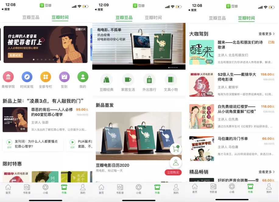 早在2011年,阿北就宣布豆瓣已基本实现盈利,那年9月豆瓣在完成第三轮5000万美元融资后,开始更主动的商业尝试,在传统的品牌广告营收、图书/电影票导流模式外,豆瓣在以“豆瓣东西”探索导购模式后,重点布局自营电商平台豆瓣市集,2017年推出付费内容产品“豆瓣时间”,上线5天销售额破百万。这一年豆瓣关闭一些长期没有起色的产品和业务,包括一拍一、豆瓣东西、同城票务交易和一刻。2018年豆瓣6.0上线,在强化书影音这一起家业务的同时,首页有了动态与推荐,负责“恰饭”的市集也拥有了一级入口,这表明豆瓣商业化在加速。豆瓣多年来不再融资,却能继续运转,证明这家公司已经具备健康的商业化能力。