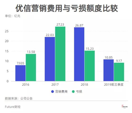 从财报上看,2016-2018年优信营销费用分别占当年营业总收入的96.12%、112.80%、81.04%,营销费用几乎与亏损额持平,三年累积亏损56.79亿元。戴琨曾说“广告打得小孩子都知道”。