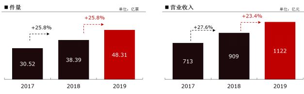 年报披露,2019 年,顺丰速运物流业务实现件量48.31亿票,同比增长25.84%。根据21世纪经济报道的报道,放到2019年全国快递业务量去看,顺丰的市场占率为7.61%左右,较2018年略微提升0.04个百分点。