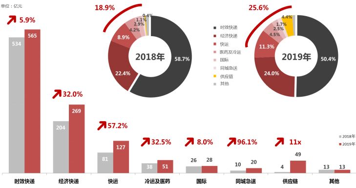 比如2018年时,顺丰的快运、冷运、国际、同城配(同城急送)分别实现营业收入(不含税)80.5元、42.4亿元、26.3亿元、10.0亿元,同比分别增长83.0%、84.9%、28.7%、172.2%。