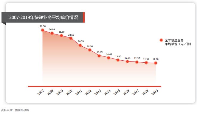 正如顺丰年报解释的:近年来,快递行业单票价格持续下滑,行业快递平均单价从2007年的28.50元/件快速下滑至2019年的11.80元/件,主要原因在于占快递业务量较大比例的电商快递增速较快,且电商快递竞争同质化严重,价格竞争成为电商快递扩大份额的主要手段。