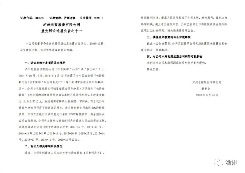 不过,根据湖南省高级人民法院一审判决显示,对于泸州老窖通过刑事执行程序不能追回的损失,由农行迎新支行承担40%的赔偿责任,中国农业银行长沙红星支行承担20%的赔偿责任,其余损失由公司自行承担。对此,泸州老窖于上诉期内就前述判决向最高人民法院提起上诉。时至今日,该案以维持原判终审落幕,业内指出此案或将就此终结。