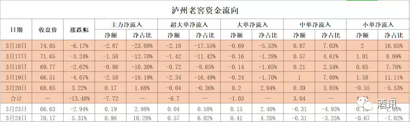 除此之外,泸州老窖还因资本市场疲软,业绩下滑而与“前三甲”渐行渐远。目前,疫情全球扩散,股市持续震荡,白酒板块也因受牵连。3月16日至20日期间,泸州老窖股价连遭4日下跌,一周累积跌幅13.48%,主力资金流出也近8亿元。