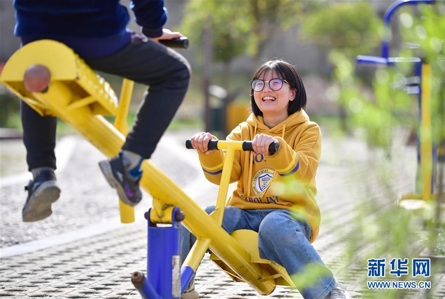 陕西省宁强县大安镇冯家营村邓彩艳读大学的女儿赵薇(右)与弟弟在安置点的广场上玩耍(3月13日摄)。 新华社记者 邵瑞 摄