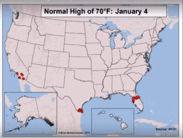 设计路线绝非易事,因为大多数气象站在大多数时间都达到日常“平均量”70华氏度。你可以从下面这个动图简单看看美国一年内气温70华氏的大致变化:
