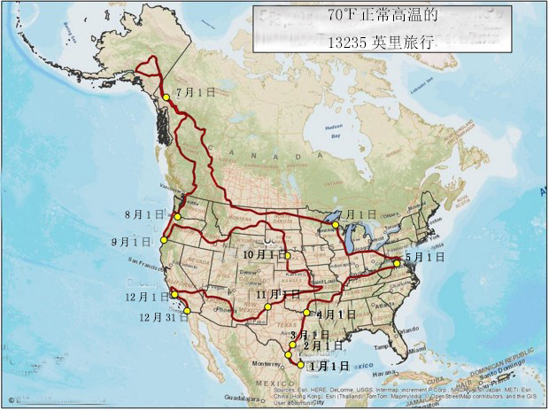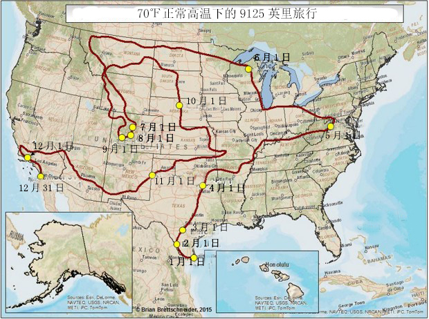 在美国热/冷得见鬼的地盘上,这样的路线的确存在。气象学家布莱恩·布雷特施奈德(Brian Brettschneider)最近突发奇想设计了一条路线,蜿蜒1.3万多英里,从德克萨斯州的南端发源,至阿拉斯加南下到圣地亚哥。按着这条路线走,可以让游历者的身体每天感受约70华氏度(21℃)的适宜温度,可谓是真正做到了四季如春。