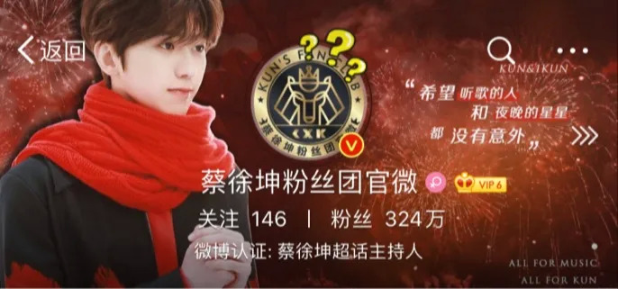 蔡徐坤粉丝团官微成立于2018年偶像练习生节目播出初期,现已发展成为微博粉丝数超过320万、下设蔡徐坤数据站、蔡徐坤海外站及国内10个地方分团、蔡徐坤最大的综合应援大站。