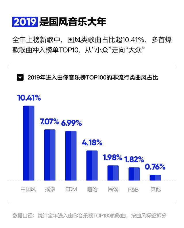 在最新公布的《2019年华语数字音乐年度报告》中,说唱类音乐和摇滚乐、中国风、民谣歌曲成为报告中唯四列出相关榜单的音乐类型,而在 2019年进入由你音乐榜TOP100的非流行类曲风中说唱类占比为4.18%,位列第四位。
