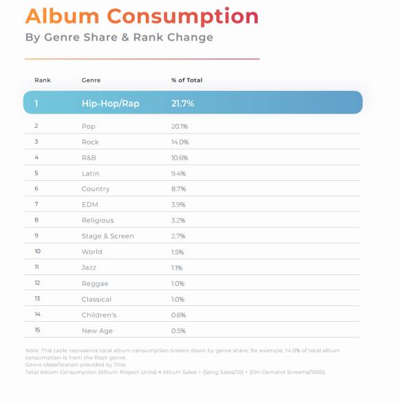 而在美国,Buzz Angle《2018年终音乐报告》《2019年终音乐报告》显示,在美国2018年音乐专辑消费中,说唱风格以21.7%的占比位列第一,流行风格以20.1%的比例居于第二位;而在2019年度畅销专辑总销量TOP20中,说唱音乐占比为55%,其中位居榜首的是Post Malone的《Hollywood’s Bleeding》,第二位的是Billie Eilish的《When We Fall Asleep Where Do We Go》,在前三甲中占据了两个席位。