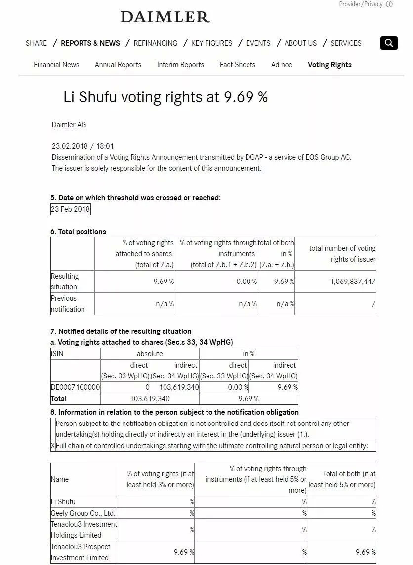 2018年2月24日,吉利集团有限公司宣布,已通过旗下海外企业Tenaclou3 Prospect Investment Limited投资公司收购戴姆勒9.69%具有表决权的股份,如此一来,吉利超过了持有6.8%的科威特投资局和6%的贝莱德,一跃成为戴姆勒最大的单一股东。监管文件显示,吉利集团拥有超过1.036亿股的投票权。