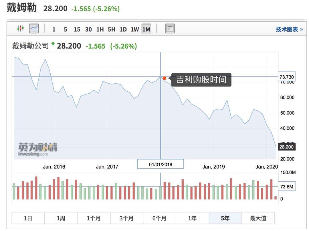 吉利认购的戴姆勒股票,目前“亏损”已过半。