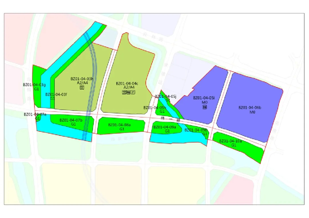 与此同时,由于纬一路道路红线调整的原因,地块内其他公园绿地、文体用地和工业研发用地的用地边界都进行了相应调整。