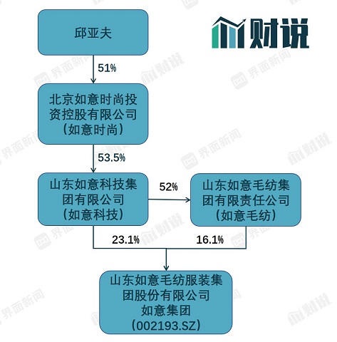 如意集团乃至如意科技的股权架构较为复杂。如意集团实际控制人为邱亚夫。他通过北京如意时尚投资控股有限公司(下称如意时尚)旗下的如意科技和山东如意毛纺集团,分别持有如意集团23.1%和16.1%的股份。