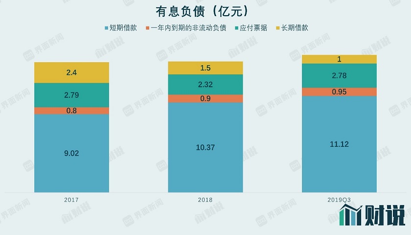 近三年,如意集团的短期负债快速增长,平均增速达到了29%。截至2019年9月30日,如意集团短期负债为11.12亿元,占资产总额的22.68%。除此之外,如意集团还有2.78亿元的应付票据,0.9亿元的一年以内到期的长期借款和1亿元的长期借款。以上这些如果逾期不还,就构成违约,会直接损害如意集团的债务评级和银行授信。