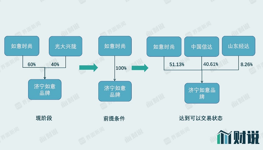 济宁如意品牌要注入上市公司之前,如意时尚需要完成回购另一股东光大兴陇所持济宁如意品牌40%股权。并且,光大兴陇持有的济宁如意品牌40%的股权过户登记至如意时尚名下是这场交易执行的先决条件。
