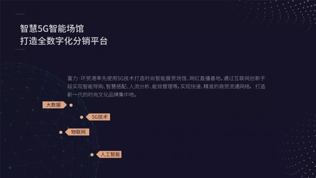 在这里,智能将触手可及。例如,当客户进入这个场馆后,可以通过智能导购找到所需货品以及对应的商铺,通过终端设备导航直接精准引流至商铺,同时,通过场馆设备及手机终端有望实现一键完成产品搭配、下单、发货,实现精准匹配供需两端,提高采购效率;例如,通过人流动态分析、数据分析等大数据分析与计算能力,赋能商户指引生产、备货、销售;……综上,智能场馆的5G能力超乎想象,场馆内外均设有5G基站,高速、高效、无延时地帮助商户实现智慧化管理。“实现人、货、场”三位一体的升级,赋能时尚产业,为企业提供专业优质的产业链服务,推动消费转型。