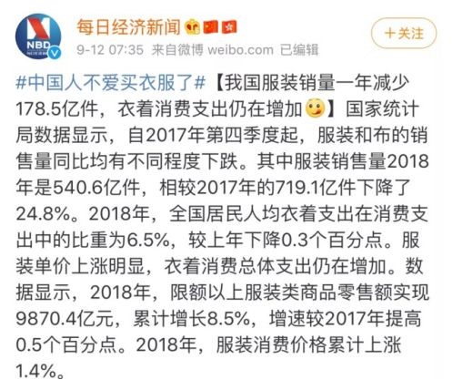 时尚产业近几年“唱衰”的声音都是不绝于耳。早前一条“中国人不爱买衣服了”的热搜更是霸屏微博,仔细分析数据不难看出:服装销售量减少,衣着消费增加,除了服装的客单价在增长,我国居民对服装的要求更高了,往时尚、档次需求方向发展。