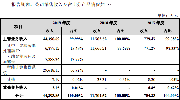 寒武纪的主营业务由三部分构成,分别是终端智能处理器IP、云端智能芯片及加速卡和智能计算集群系统。其中后两项业务都是2019年才开始出现的,在2017年和2018年,寒武纪只有终端智能处理器IP一项业务。