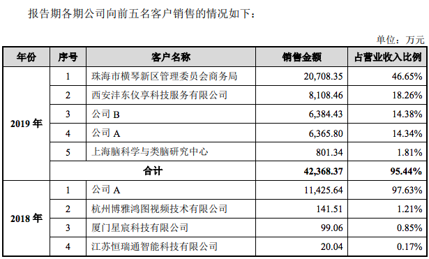 2019年寒武纪的前两大客户分别为珠海市横琴新区管理委员会商务局、西安沣东仪享科技服务有限公司。这两大客户分别是政府和政府关联类公司,占到营收的比例分别为47%和18%。贡献营收超过14%的第三大客户公司B,据招股书披露,为寒武纪的关联方。