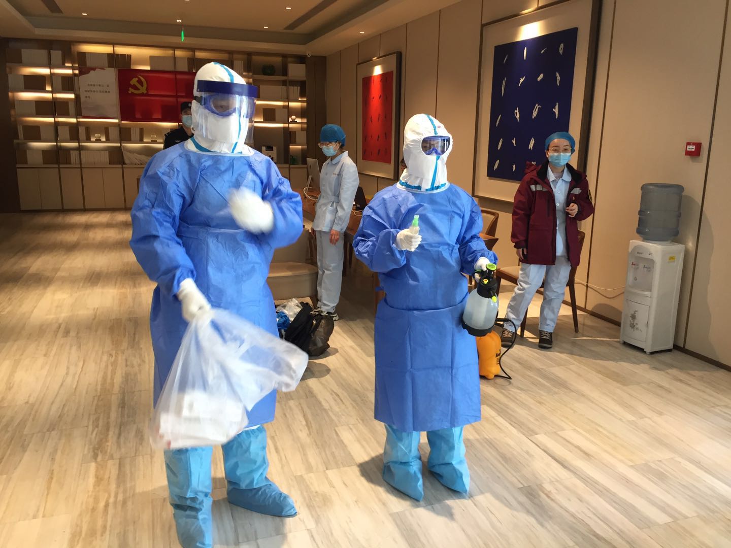 驻扎在全季酒店的临时工作组由这些人组成:酒店员工,公安分局及派出所人员,街道办,区政府,疾控中心的医护人员等。