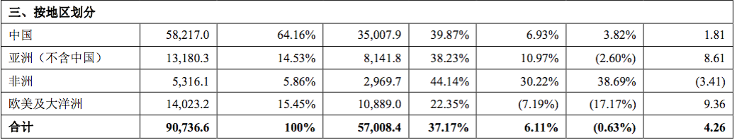 按地区划分来看,中国2019年实现营业收入582.17亿元,占营业收入比重的64.16%;亚洲(不含中国)实现营业收入131.8亿元,占营业收入比重的14.53%,非洲实现营业收入53.16亿元,占营业收入比重的5.86%;欧美及大洋洲实现营业收入140.23亿元,占营业收入比重的15.45%。
